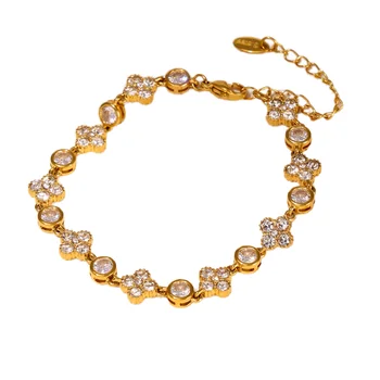 Lincy Wholesale Waterproof 18k Gold Plated Stainless Steel Cubic Zirconia Clover Flower Trendy Chain & Link Women's Bracelets