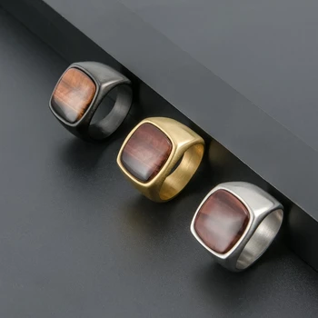 Personalized Classic Chunky Finger Rings Black Agate Natural Stone Mens Stainless Steel Rings